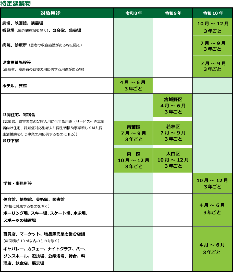 ・特定建築物のうち、政令で指定されていない建築物については、それぞれの特定行政庁において指定されています。