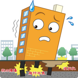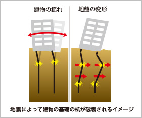 地震による揺れや地盤の変形で基礎杭に無理な力がかかり損傷してしまうことで、建物の重量を支えられずに傾斜してしまいます。