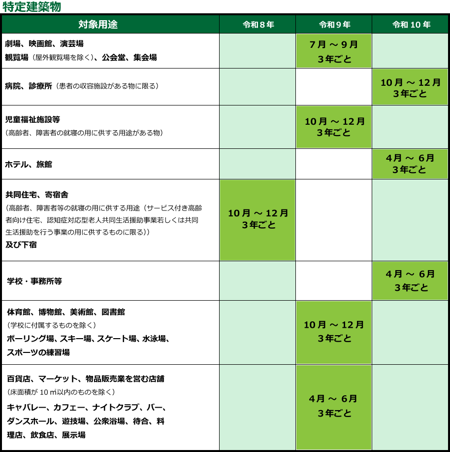 ・特定建築物のうち、政令で指定されていない建築物については、それぞれの特定行政庁において指定されています。