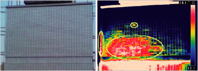 赤外線エネルギーの大きさは熱エネルギーに比例する特性から、赤外線エネルギーの強弱が温度分布され、建物の異常個所が分かります。 外壁やタイルの浮きや剥がれ、劣化の状況を赤外線の特性を使用して調査します。(下図)