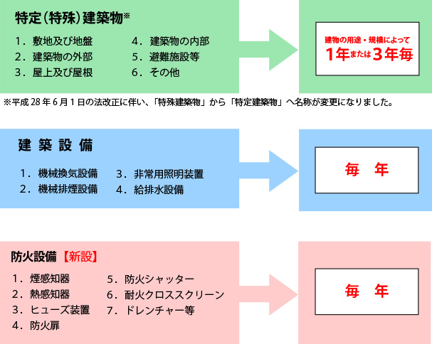 平成28年6月からの改正建築基準法の施行に伴い、定期報告の対象となる建築物、建築設備の用途・規模などの条件が変わりました。